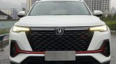 The white Changan CS35 PLUS 2022 Blue Whale NE 1.4T DCT Premium compact SUV boasts a sleek, modern design tailored for urban lifestyles. Its front fascia features a bold, blacked-out grille flanked by sharp LED headlights, creating a dynamic and youthful silhouette. Smooth body lines run from the front fenders to the rear, accentuating its aerodynamic shape while maintaining a sturdy compact SUV stance. The crisp white paint finish highlights the vehicle’s clean contours, offering a timeless appeal and being easy to maintain—perfect for busy city drivers. Stylish multi-spoke alloy wheels complement the overall look, adding a touch of elegance to its practical build.
