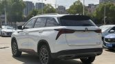 Changan CS75 PLUS 2022 model in a white finish presents a modern and sleek appearance. Its front fascia features a distinctive grille design integrated with standard LED lighting elements, creating a sharp visual signature. The white color accentuates the vehicle’s sculpted body lines and muscular stance, enhancing its overall presence on the road. The design balances aerodynamic considerations with a contemporary