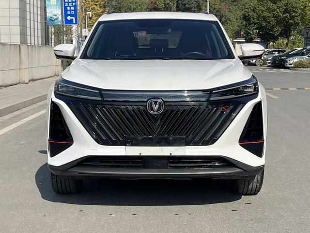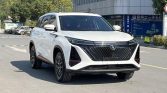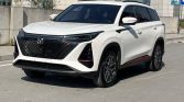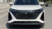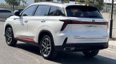 The crisp white finish of the 2022 2nd Gen Changan CS75 PLUS 1.5T Automatic Luxury SUV highlights its sleek, modern silhouette. Up front, a bold chrome-accented grille pairs with sharp LED headlights and daytime running lights, creating a striking, confident fascia. Flowing waistlines stretch from the front fenders to the rear, complemented by 18-inch multi-spoke alloy wheels and roof rails that add both style and utility. The rear features a seamless through-type LED taillight, dual-exit exhaust pipes, and an integrated roof spoiler—enhancing its dynamic appeal.