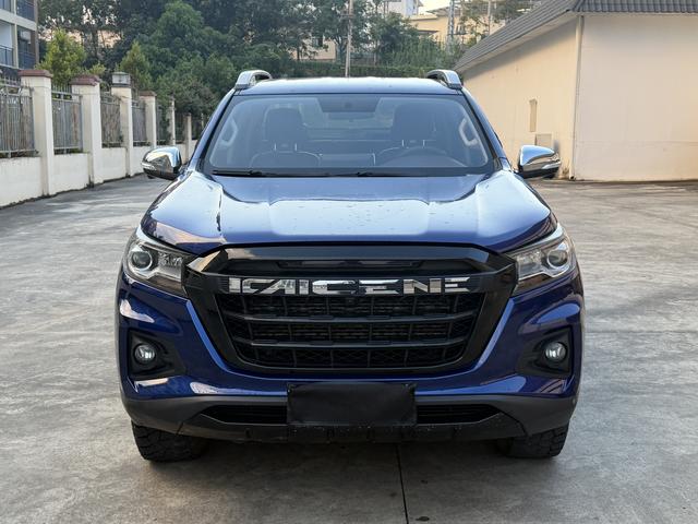 pickup 2021 model presents a bold and functional presence in its blue exterior finish. It features a commanding front grille, pronounced body contours, and robust wheel arches. The design merges a practical, rugged aesthetic for work purposes with a stylish profile suitable for personal use, highlighted by its distinctive color.