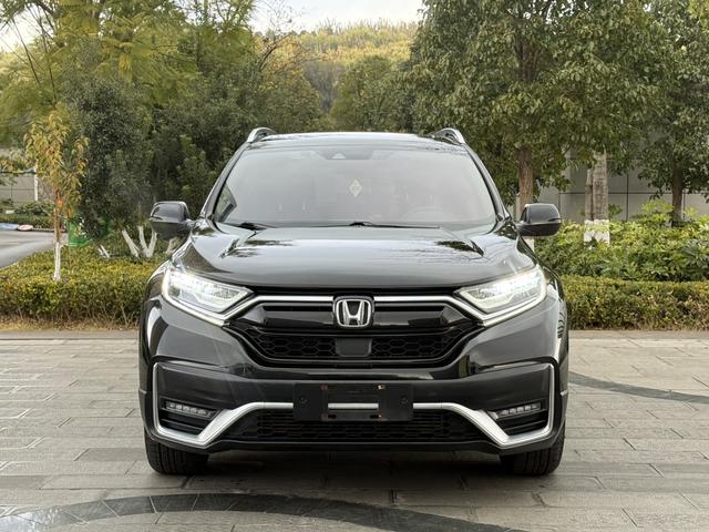 The Honda CRV  SUV 2021 model presents a confident and modern stance, with the black exterior finish accentuating its muscular proportions and sharp character lines. The front fascia features a distinctive grille that integrates seamlessly with the multi-reflector LED headlights, creating a wide and assertive look. The sleek profile is complemented by purposeful elements like roof rails and body-colored trim, enhancing its sport utility character without appearing overly aggressive. The overall design is both aerodynamic and practical, projecting an image of sophistication and capability suitable for both urban and adventurous settings.
