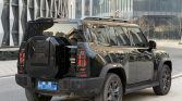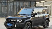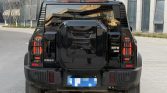 The exterior’s black finish emphasizes its bold, boxy silhouette and purposeful design. The dark paintwork highlights the vehicle’s muscular wheel arches, high ground clearance, and protective body cladding. A robust front bumper houses integrated tow hooks and LED fog lamps, while the upright grille and square headlights create a commanding presence. Roof rails and a standard roof rack system enhance cargo versatility, and the side-hinged rear tailgate features a full-size spare tire mount, underscoring its expedition-ready credentials.