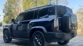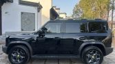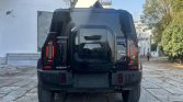 The exterior’s black finish emphasizes its bold, boxy silhouette and purposeful design. The dark paintwork highlights muscular wheel arches, high ground clearance, and protective body cladding designed for harsh conditions. A robust front bumper houses integrated tow hooks and LED fog lamps, while the upright grille and square headlights create a commanding presence. Roof rails and a standard roof rack system enhance cargo versatility, and the side-hinged rear tailgate features a full-size spare tire mount, underscoring its expedition-ready credentials and functional character.