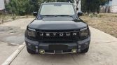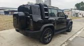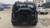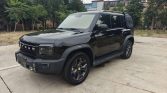 The exterior’s black finish emphasizes its bold, boxy silhouette and purposeful design. The dark paintwork highlights the vehicle’s muscular wheel arches, high ground clearance, and protective body cladding. A robust front bumper houses integrated tow hooks and fog lamps, while the upright grille and square LED headlights create a commanding presence. Roof rails and a standard roof rack system enhance cargo versatility, and the side-hinged rear tailgate features a full-size spare tire mount, underscoring its expedition-ready credentials.