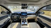 The seven-seat cabin combines premium materials with advanced technology, featuring leather-appointed surfaces and metallic accents. A large central touchscreen with navigation and smartphone integration complements the digital instrument cluster. Heated and ventilated front seats, tri-zone climate control, and acoustic glass insulation ensure comfort for all occupants across three rows of seating.