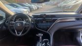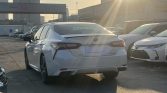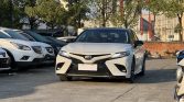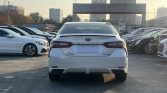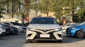 This Toyota Camry sedan 2019 model presents a dynamic and sport-oriented profile in a classic white finish. Its design features a sleek, athletic silhouette accentuated by a distinctive front grille, sharp character lines, and exclusive sport-style elements. The overall aesthetic emphasizes a bold and expressive stance, balancing aerodynamic efficiency with a visually engaging and youthful character.