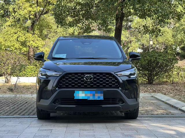 This Toyota Corolla Cross  2022 model presents a modern and dynamic SUV profile in a classic black finish. Its design features a confident stance with a distinctive front grille, sleek LED lighting elements, and sculpted body lines. The balanced proportions and refined contours emphasize a versatile character, suitable for both urban commuting and weekend leisure activities.